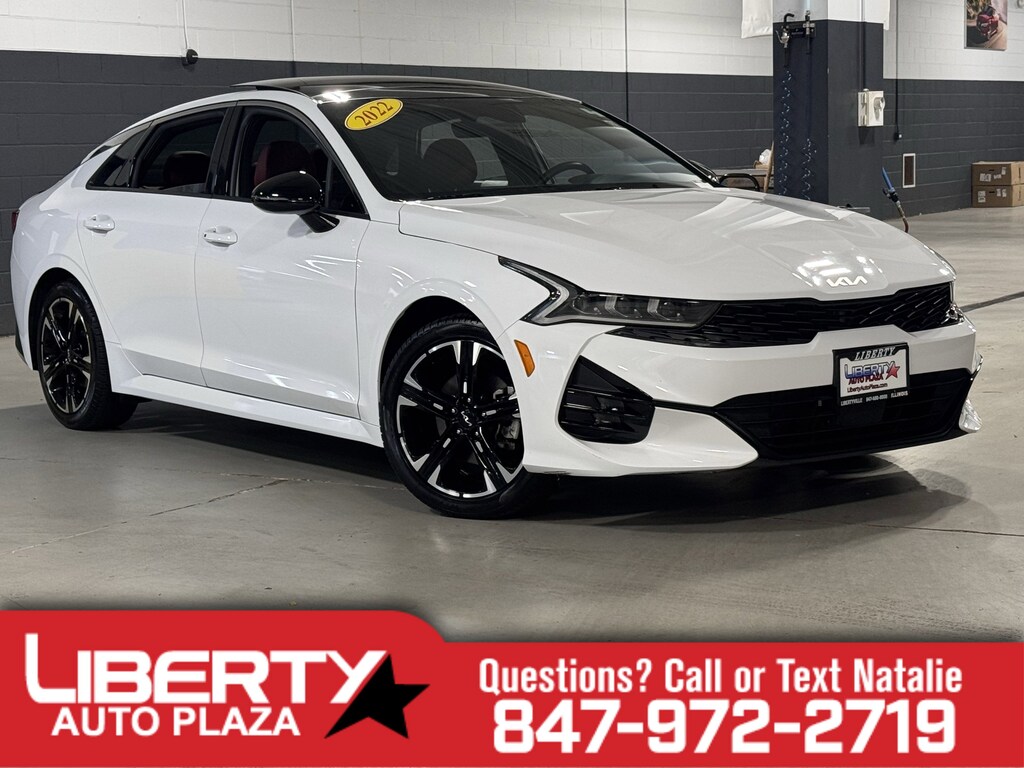 Glacial White Pearl 2022 Kia K5 GT-Line AWD 8-Speed Automatic I4 1 OWNER CERTIFED CARFAX**, **LEATHER HEATED SEATS**, **ALLOY WHEELS**, **BACK UP CAMERA**, **NAVIGATION **, **ALL WHEEL DRIVE**, **PREMIUM SOUND SYSTEM**, **NON SMOKER**, **LOCAL TRADE IN**, **SUNROOF/MOONROOF**, **BLUE TOOTH/ HANDS FREE**, **I POD CONNECT**, Apple CarPlay & Android Auto, Automatic temperature control, Forward Collision Avoidance-Assist - Cyclist, Forward Collision Avoidance-Assist - Junction Turn, Front dual zone A/C, Front fog lights, Gloss Black Pillar & Door Frame Cover, GT-Line AWD Premium Package, GT-Line Red Interior Package, Heated Steering Wheel, Highway Driving Assist, LED Interior Lighting, LED Projection Headlights, Navigation-Based Smart Cruise Control - Curve, Panoramic Sunroof, Power driver seat, Smart Cruise Control w/Stop & Go.