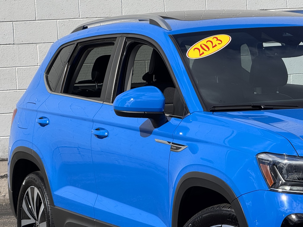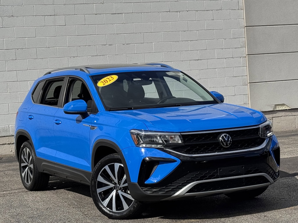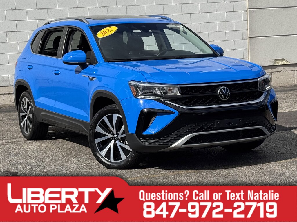 Cornflower Blue 2023 Volkswagen Taos 1.5T SE AWD 7-Speed DSG Automatic with Tiptronic 1.5L I4 Turbocharged DOHC 16V LEV3-SULEV30 158hp 1 OWNER CERTIFED CARFAX**, **ALLOY WHEELS**, **BACK UP CAMERA**, **CLEAN CERTIFIED CARFAX**, **ALL WHEEL DRIVE**, **PREMIUM SOUND SYSTEM**, **NON SMOKER**, **LOCAL TRADE IN**, **SUNROOF/MOONROOF**, **BLUE TOOTH/ HANDS FREE**, **I POD CONNECT**, 6 Speakers, Active Blind Spot Monitor, Auto-Dimming Rearview Mirror (SRV), Emergency communication system: VW Car-Net Safe & Secure 5-year, Heated Front Comfort Seats, Heated steering wheel, Panoramic Sunroof Package, Power driver seat, Radio: MIB3 Composition Media AM/FM/HD.